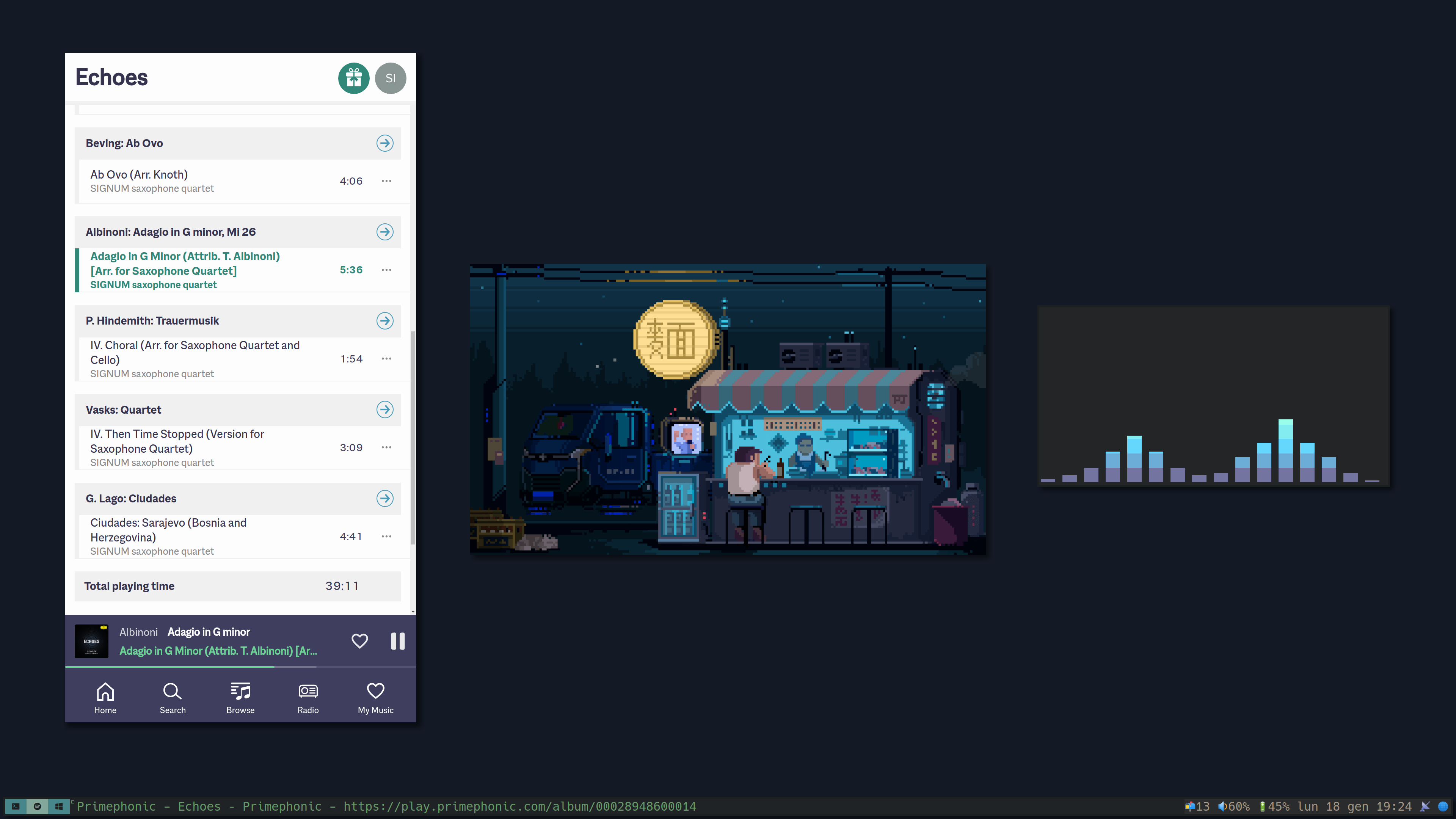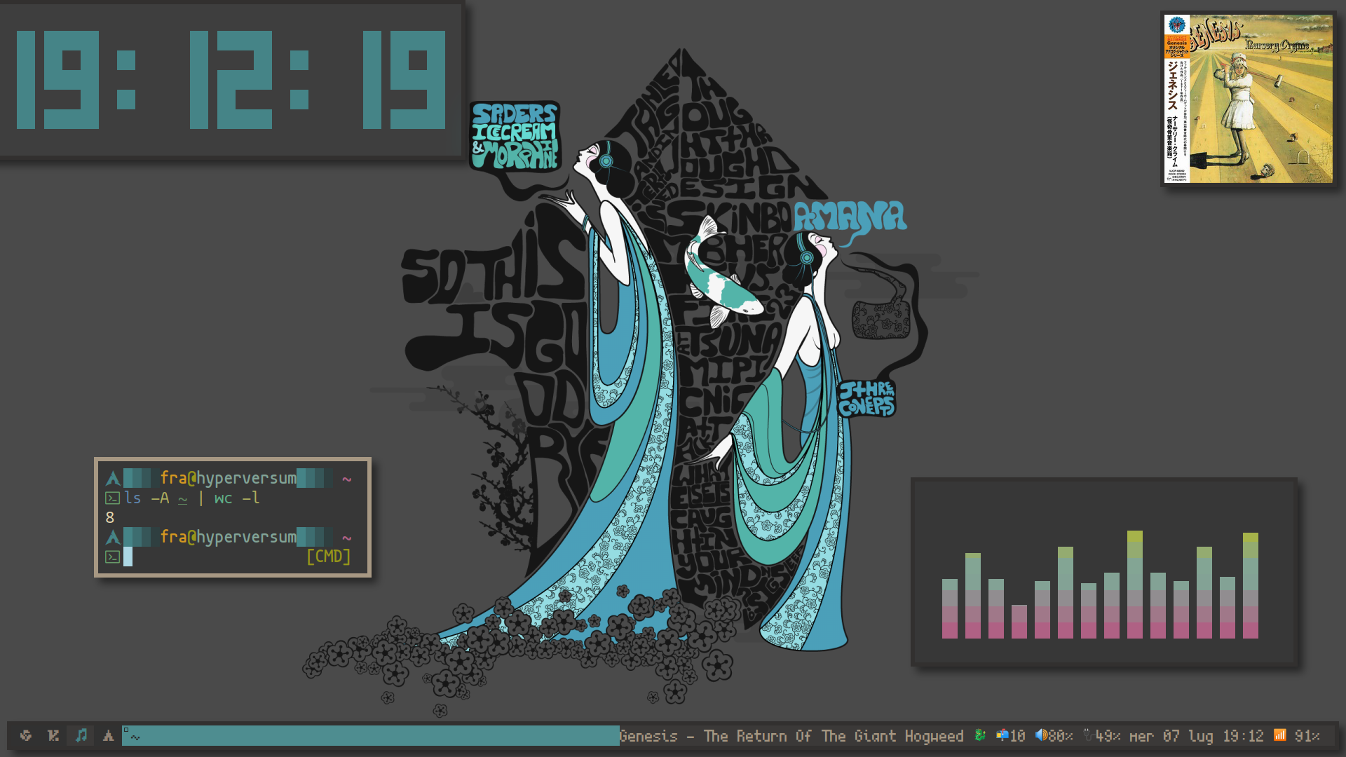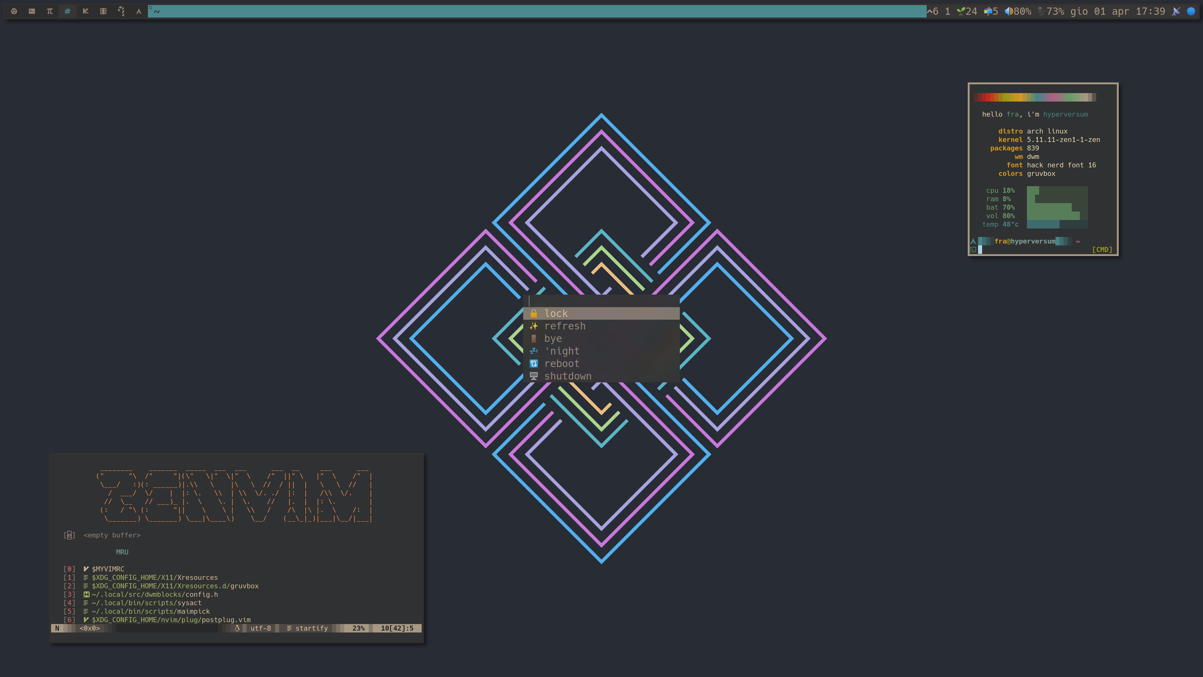 - Suckless utilities (links are to my patched repositories): dmenu, dwm (Window Manager), st (terminal emulator) and xss+slock (screensaver).