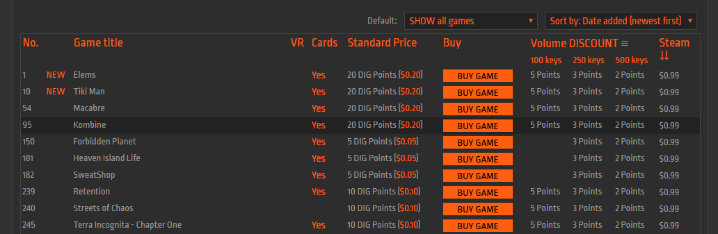 - Ability to dynamically sort by DIG price, Steam price, etc.