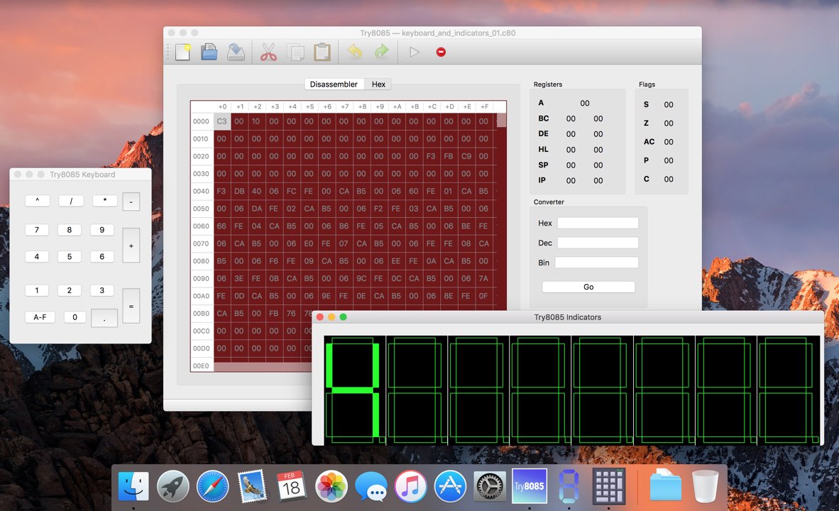 Try8085 is an integrated development environment and simulator of the 8085 microprocessor. It is intended as an educational tool for teaching and studying the 8085 assembly language.