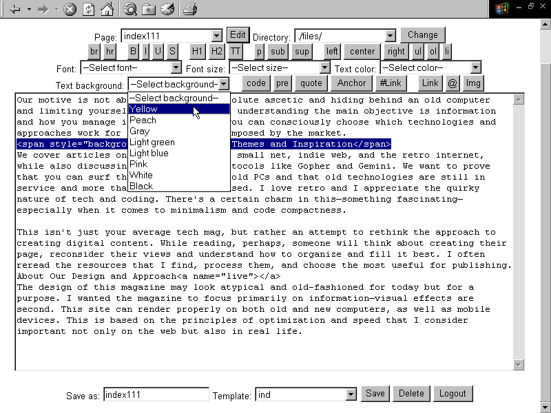 as you can see, it is a little similar to the Windows 95 interface, made in HTML4 without frameworks and add-ons that could work with very old browsers from the 90s (will work in IE5 since it has support for UTF8).